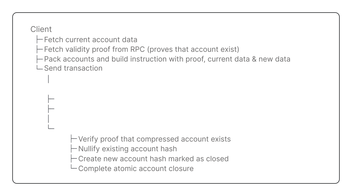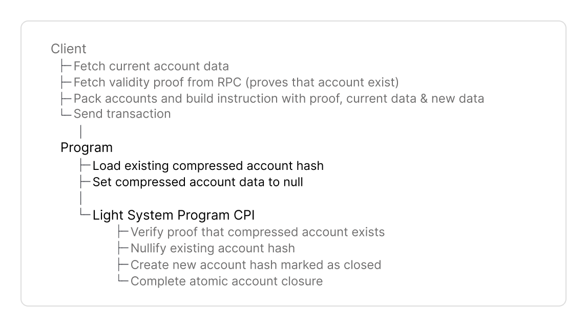 This guide will cover the components of a Solana program that closes compressed accounts. Here is the complete flow to close compressed accounts: