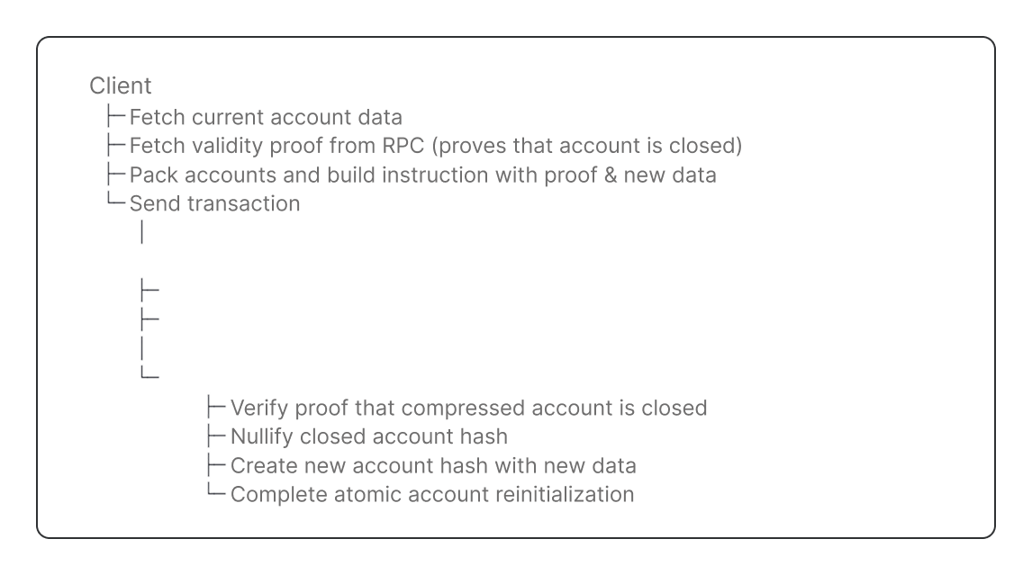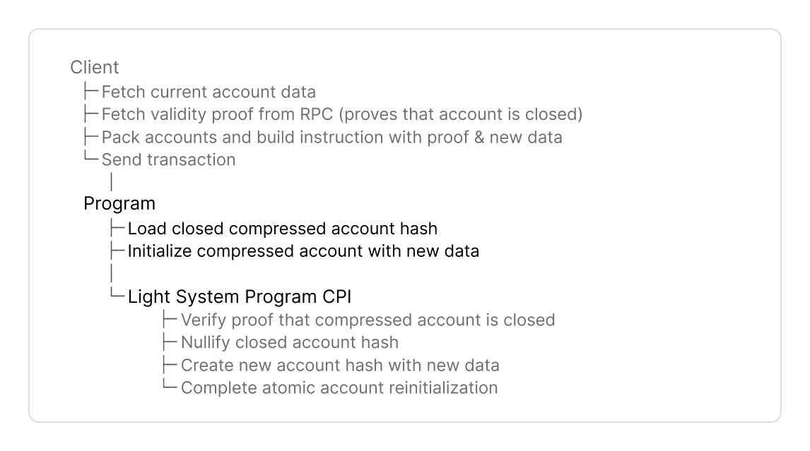 This guide will cover the components of a Solana program that reinitializes compressed accounts. Here is the complete flow to reinitialize compressed accounts: